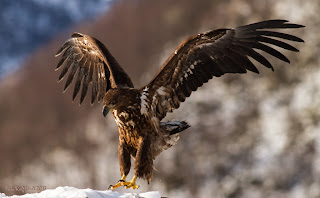 I dag satt unghauken i et par timer på åtet, men unnlot å sette seg på tildelte sittepinner, forøvrig "påmontert" en fristende død kråke som dessert... Desto morsommere var det å følge en av de andre haukene på andre siden av vannet.. På ca 300-400m avstand var det god underholdning å se hvordan hauken gjorde tilslag mot kråkene som fløy over vannet. Den tok dem ikke, men jaget dem skikkelig innover heia...kjempe underholdning! :-)